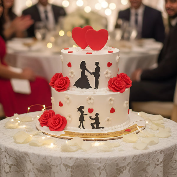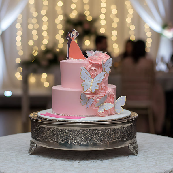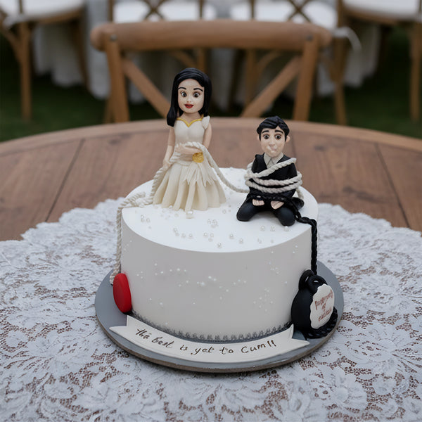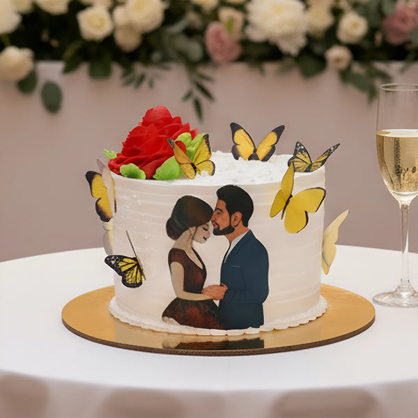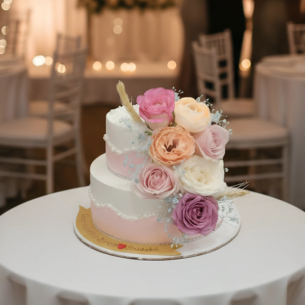 The current trends focus on elegance, simplicity, and personal expression. Minimal nude cakes, soft pastel colours, fresh florals, and gold accents are among the most popular ones.. Couples are also opting for heart-shaped, 2 or 3 layer cake and playful bride-and-groom themes to add a unique, memorable touch to their wedding celebration.